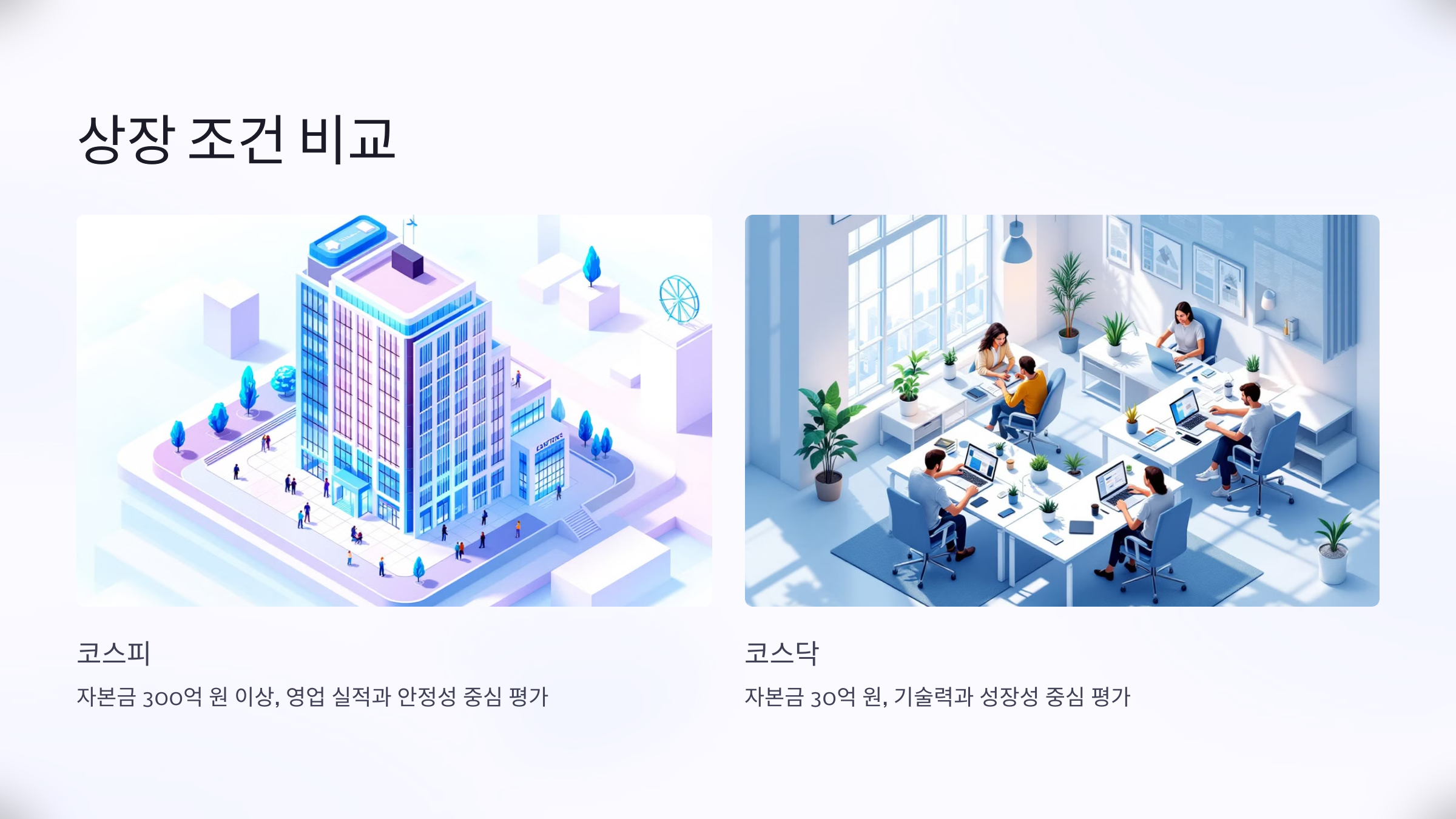 코스피와 코스닥 상장 조건은 기업의 규모와 안정성을 중시하는 코스피와는 다르게, 코스닥은 기술력과 성장성을 기준으로 상장 조건이 더 유연한 편이에요.