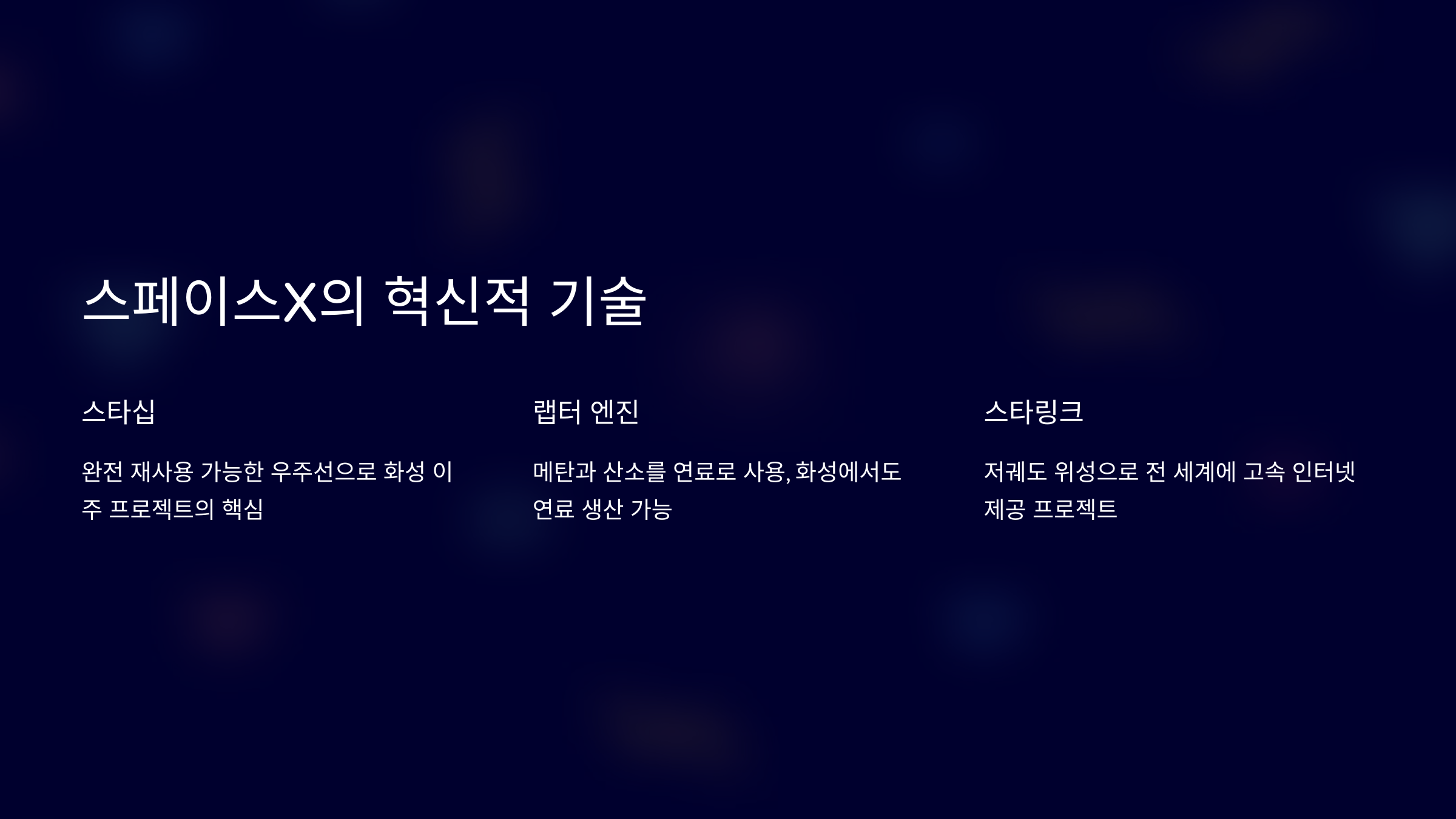 스페이스X는 스타십(Starship), 랩터 엔진(Raptor), 스타링크(Starlink) 등 자체 개발 기술을 통해 우주 산업의 판도를 바꾸고 있어요. 이 기술들은 미래의 우주 생활과 지구와의 연결을 위한 중요한 역할을 하고 있습니다.