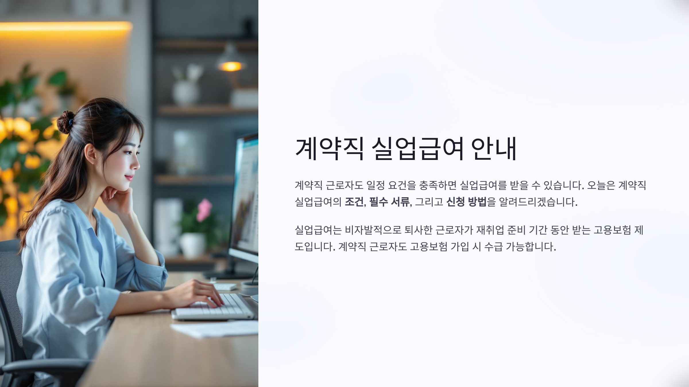실업급여는 비자발적으로 퇴사한 근로자가 재취업 준비 기간 동안 생활 안정과 취업 지원을 위해 지급받는 고용보험 제도입니다. 계약직 근로자도 고용보험에 가입되어 있다면 실업급여 수급이 가능합니다.